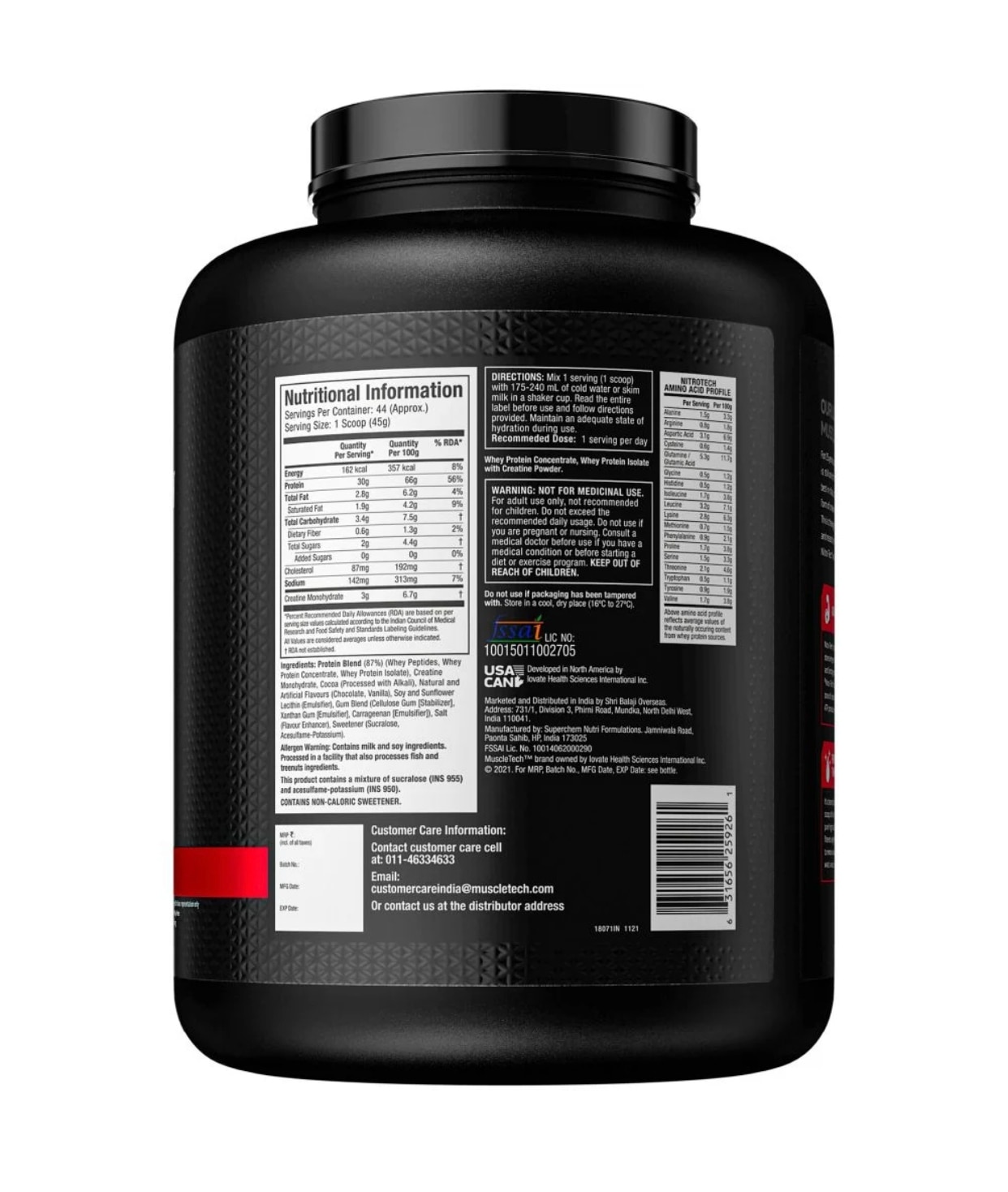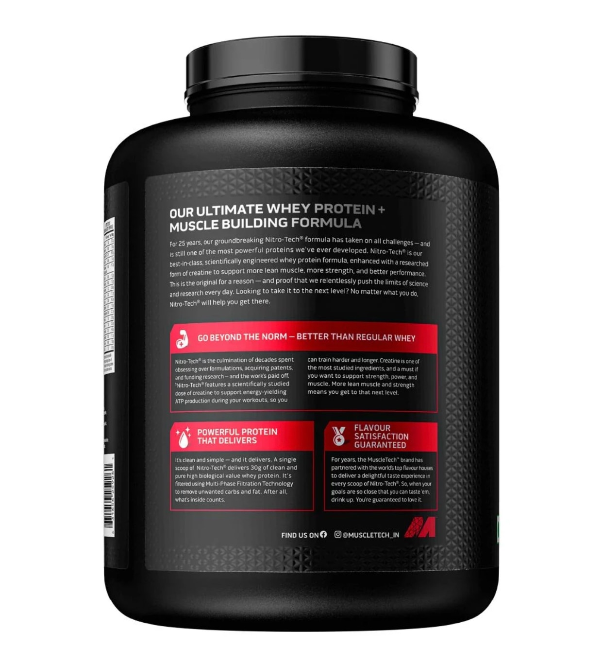 High on Whey Protein: MuscleTech Nitro-Tech provides you with lean muscle building 30g of premium whey protein, primarily from whey protein peptides and whey protein isolate. More Muscle & Faster Recovery: With 3g of creatine, you can build more muscle than with just protein alone. It boosts your strength and restores energy for more lean muscle with each push. It also contains 5g of glutamine & precursor, 6.7g of BCAA which helps in faster recovery from fatigue. Miscibility & Digestibility: Nitro Tech contains proteins that go through a multi-phase filtration process to give you pure protein isolate that mix easily with water and get absorbed faster into your body. The Perfect Taste: Comes in 5 unique flavours with artificial and natural flavor's to give your workouts the gourmet kick.